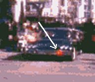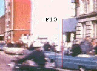 Above shows two frames from the Hughes film, 7 frames apart, showing Mclain passing in the foreground. The film was shot from the corner of Main & Houston. (The 'F' - frame - numbers are arbitrary, just the difference counts) . According to an analysis of the known rate at which the JFK limo. warning lights flash in the same movie (see picture below) ...