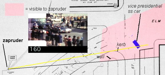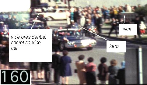 Zapruder frame 160 shows the LBJ SS car making the turn onto Elm in the background. If, for example, the Hughes frame (above) & the Zapruder frame (left) happened to be taken synchronously, then this would leave McLain a mere 15 Z frames = 0.82 seconds to travel about 220 feet, if he is to reach the Houston-Elm junction in time to record the supposed shots. This would mean a speed of around 183 mph - obviously out of the question. |