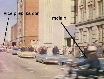 | The acoustic analysis by BB&N requires McLain to be at the junction of Houston & Elm at the time Zapruder frame 175 was shot. McLain appears in the Hughes film in the frame opposite, where the LBJ SS follow up car is apparently beginning to take the turn onto Elm further up the street. | ![]() |