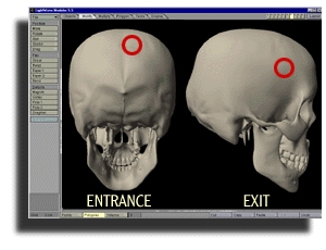 <quote> A trajectory analysis of JFK's inshoot/outshoot head wounds, shows an inconsistency with the HSCA trajectory conclusions. The Zapruder film shows JFK receiving his head wound at frame 313. Using medical data from the House Select Committee on Assassination's (HSCA) Forensic Pathology Panel and Zapruder frame 312 (JFK's last known position before impact), a trajectory was plotted to determine the source of the shot. The HSCA Forensic Pathology Panel located the entrance wound on the back of the head about 10 cm above the external occipital protuberance, and 1.8 cm to the right of the midline. An exit wound was located near the right temple 11 cm in front of, and 1 cm below the entrance wound, about 5.5 cm right of the midline. These points were located on a computer model representing JFK's skull. The two points were connected with a straight line and projected rearward 200 feet to represent the trajectory of a missile passing through these two points. The trajectory track was then applied to the recreation at the equivalent of Zapruder frame 312. <unquote> |