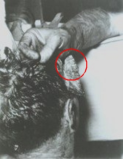 The HSCA exit wound is found, on analysis *, to emerge through the anterior section of the large flap visible on the 'back of the head' autopsy photographs. Clearly this did not happen - as there is ( it is hardly necessary to point out) no such wound there. (See photo at right).